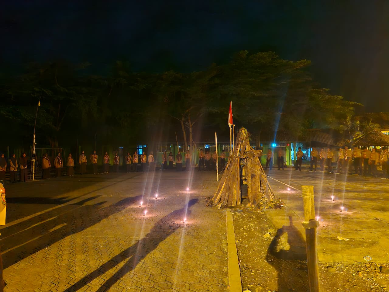Malam harinya, seluruh peserta berkumpul di lapangan utama untuk mengikuti upacara api unggun. Suasana hangat dan khidmat terasa ketika nyala api menerangi area perkemahan. Setelah api unggun, kegiatan dilanjutkan dengan perlombaan mars ambalan, di mana setiap regu menampilkan kreativitas, kekompakan, dan semangat khas masing-masing.